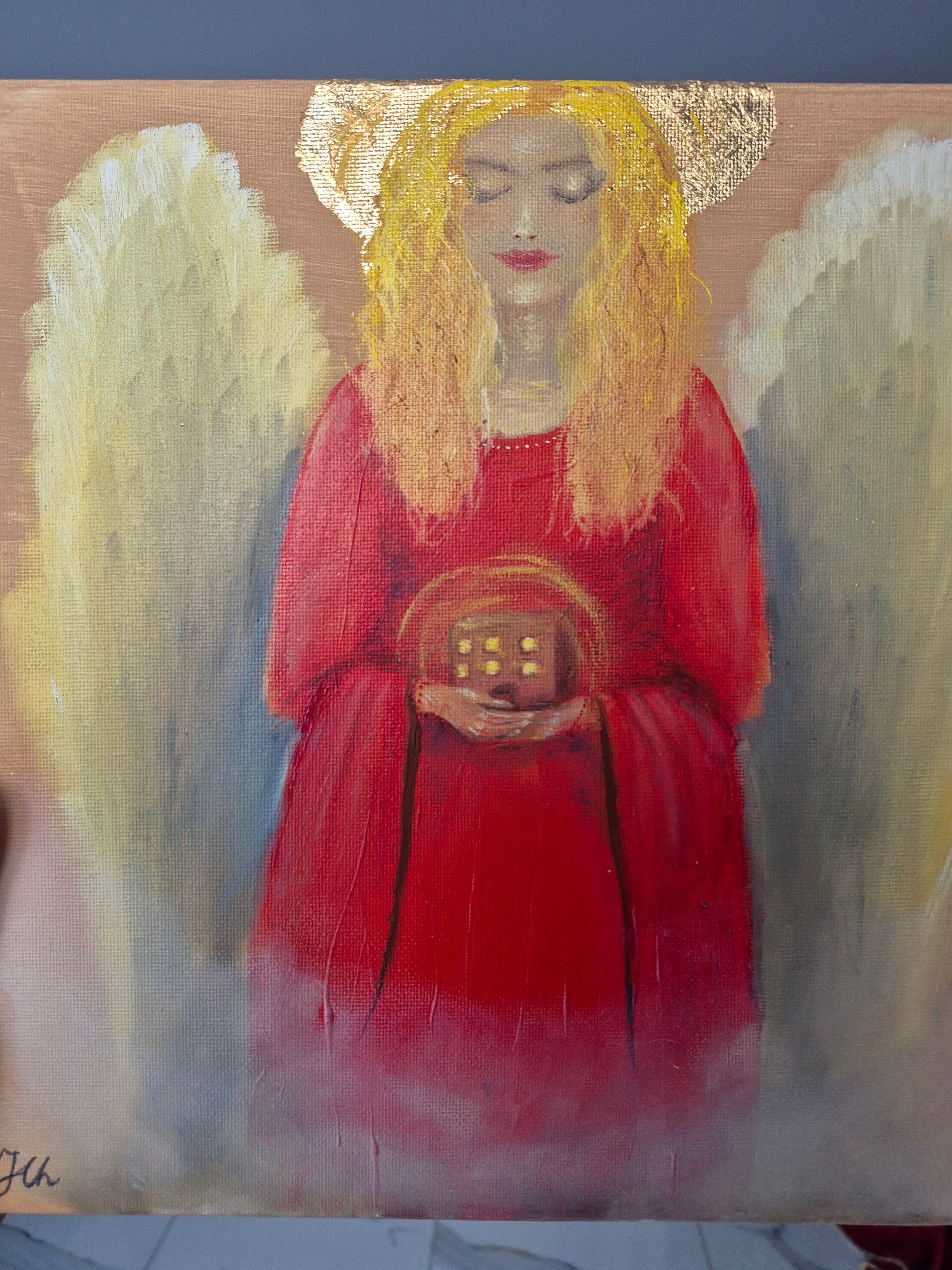 Obraz "opiekunka ciepła" to wizualny amulet domu - przedstawia anioła, który w swoich dłoniach symbolicznie trzyma dom i jego mieszkańców. Jako strażnik codzienności ma czuwać nad tym, co najważniejsze: spokojem, miłością, zdrowiem i harmonią rodziny.